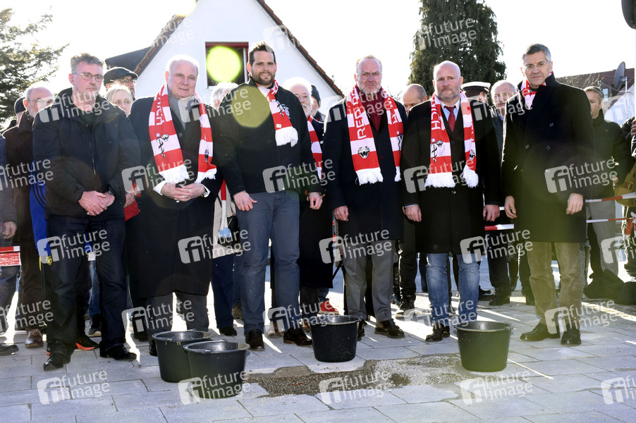 Patrick Burns, Uli Hoeneß, Mark Salzmann, Karl-Heinz Rummenigge, Christian Vorländer und Herbert Haimer bei der Grundsteinlegung für eine Gedenkvitrine zum 62. Jahrestag des Flugzeugunglücks am damaligen Flughafen München-Riem, bei dem 23 Menschen ums Leben kamen, darunter acht Fußballspieler von Manchester United, am Manchesterplatz. München, 06.02.2020