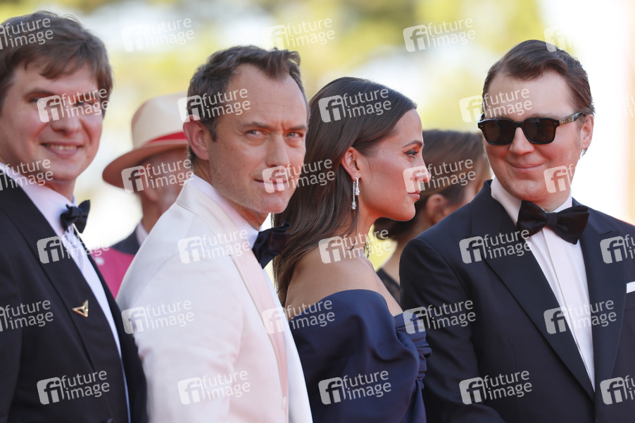 Andrei Zayats, Jude Law, Alicia Vikander und Paul Dano bei der Premiere des Kinofilms 'La Mage du Kremlin / The Wizard of the Kremlin' auf der Biennale di Venezia 2025 / 82. Internationale Filmfestspiele von Venedig im Palazzo del Cinema. Venedig, 31.08.2025