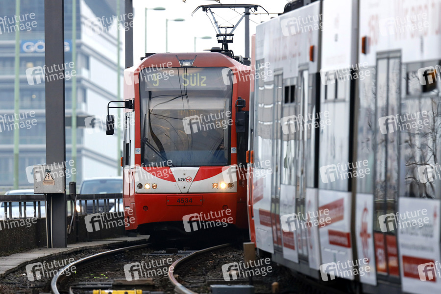 Eine KVB-Bahn der Linie 9 überquert die Deutzer Brücke in Richtung Heumarkt. An Gleisen und in Bahnen herrscht wegen der Coronakrise Maskenpflicht. Die Kölner Verkehrs-Betriebe (KVB) blicken bezüglich der Fahrgastzahlen auf ein katastrophales Jahr zurück, ausgelöst von der Corona-Pandemie sind die Fahrgastzahlen über 40 Prozent eingebrochen. (Themenbild, Symbolbild) Köln, 15.03.2021