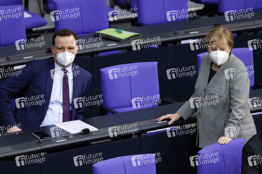 Jens Spahn und Angela Merkel in der 203. Sitzung des Deutschen Bundestages im Reichstagsgebäude. Berlin, 13.01.2021