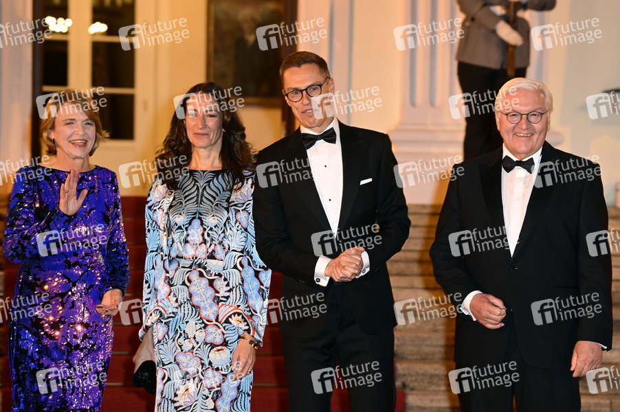 Elke Büdenbender, Suzanne Elizabeth Innes-Stubb, Alexander Stubb und Frank-Walter Steinmeier bei der Ankunft zum Abendessen anlässlich des 25. Jubiläums der Nordischen Botschaften im Schloss Bellevue. Berlin, 21.10.2024