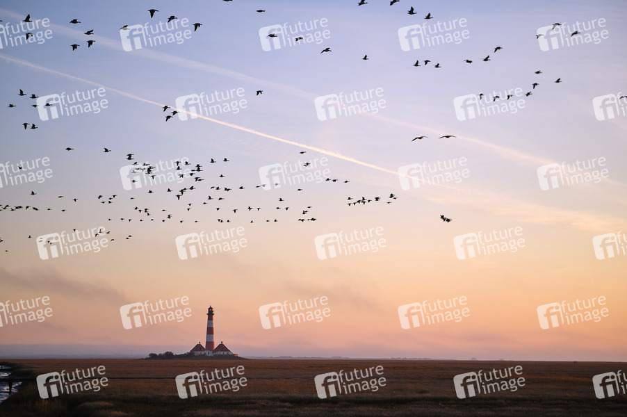 Vögel am Leuchtturm Westerheversand auf der Halbinsel Eiderstedt. Westerhever, 27.02.2021