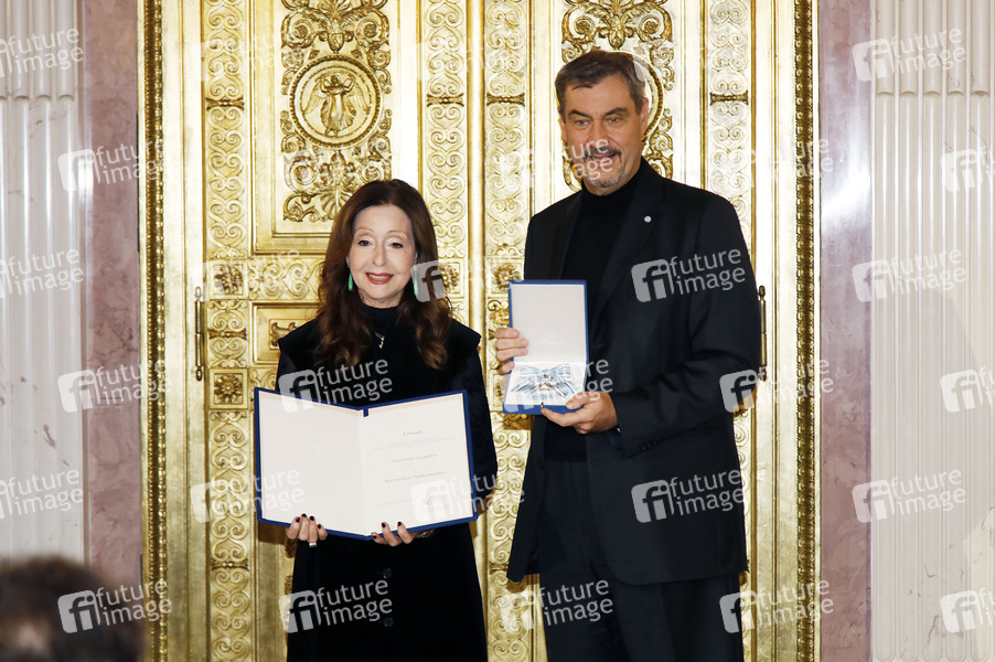 Vicky Leandros und Markus Söder bei der Verleihung des Bayerischen Verdienstordens an Sängerin Vicky Leandros durch den bayerischen Ministerpräsidenten Markus Söder im Prinz-Carl-Palais. München, 24.11.2025
