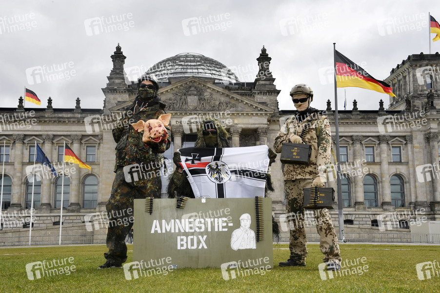 Protestaktion zur Sondersitzung des Verteidigungsausschusses des Bundestags zu den Vorfällen bei den Kommando Spezialkräften (KSK) der Bundeswehr vor dem Reichstagsgebäude. Bei der Aktion führen drei als KSK-Soldaten in voller Tarnmontur gekleidete Aktivisten vor der Kulisse des Bundestagsgebäudes die letzten Skandale der Bundeswehr-Einheit vor: Einer hält einen (künstlichen) blutverschmierten Schweinekopf in Händen, ein anderer zeigt rechtsextreme Symbolik und der dritte trägt Munitionskisten und Munition. Damit sollen die skandalträchtigen 'Partys' einiger KSK-Soldaten (bei denen reale Schweineköpfe verwendet wurden), die rechtsextremen Vorfälle in der Einheit sowie den Munitionsklau symbolisiert werden. Weiterhin wird ein Transparent mit der Aufschrift 'Kommando Spezialkräfte Auflösen' mit dem durchgestrichenen Wappen der Einheit gezeigt. Berlin, 12.04.2021