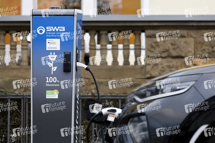 Ein Elektroauto lädt an einer Stromtankstelle von SWB 100 Prozent sauberen Ökostrom. (Themenbild, Symbolbild) Bonn, 10.02.2022