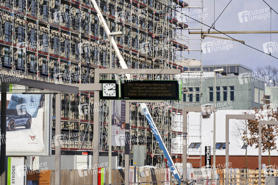 Die ÜSTRA hat den Stadtbahnverkehr aufgrund von Schäden durch Schnee und Eis in ganz Hannover einstellen müssen. - Hinweisschild an Haltestelle Stadtfriedhof Lahe in der Kirchhorster Straße. Hannover, 11.02.2021