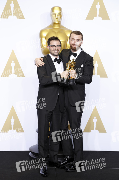 Jimmy Napes und Sam Smith (Bester Filmsong 'Writing’s on the Wall' aus 'James Bond 007: Spectre') im Presseraum der Oscar Verleihung 2016 / 88th Academy Awards im Loews Hollywood Hotel. Los Angeles, 28.02.2016