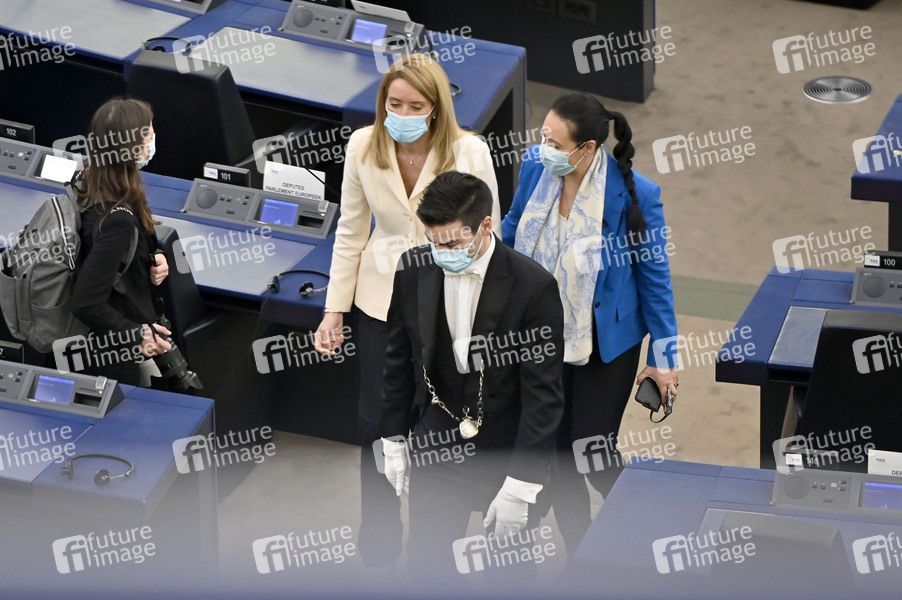 Roberta Metsola beim ersten Wahlgang zu Wahl der Palamentsvizepräsidenten / Parlamentsvizepräsidentinnen im Plenarsaal des Europäischen Parlaments. Straßburg, 18.01.2022