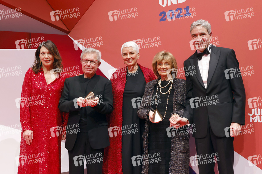 Iris Berben, Daniel Libeskind, Hetty Berg, Charlotte Knobloch und Stephan Harbarth bei der Verleihung des 'Preises für Verständigung und Toleranz' im Glashof des Jüdischen Museums. Berlin, 13.11.2021