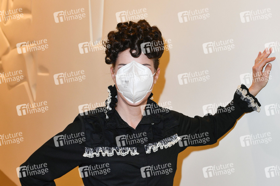 Birthe Wolter beim Fototermin mit dem (getesteten) Ensemble des Theaterstücks 'Vorhang auf für Cyrano' in Maske und Kostüm vor dem Testzentrum im Schiller Theater. Unter dem Motto 'Testen statt spielen' eröffnen die Komödie am Kurfürstendamm und der KitKatclub ein gemeinsames Testzentrum im Schiller Theater. Berlin, 07.04.2021