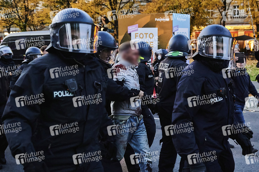 Unter dem Motto 'Wiederherstellung aller Grund- und Menschenrechte und die sofortige Beendigung des Pandemiezustands' demonstrieren Corona-Leugner vom Berliner Alexanderplatz zur Karl-Marx-Allee. Die Polizei nahm mehrere Demonstranten fest. Berlin, 25.10.2020
