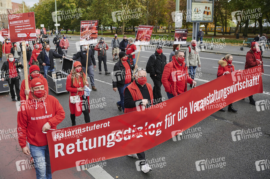 Angestellte und Solo-Selbständige der Kreativwirtschaft und Veranstaltungsbranche demonstrieren in Berlin unter dem Motto 'Für die Kultur und Veranstaltungswirtschaft - Wir schaffen das so nicht'. Künstler, Veranstaltungstechner oder DJ's fordern mehr Corona-Soforthilfen und einen Dialog, Veranstaltungen mit entsprechenden Hygienekonzepten zu ermöglichen. Aufgerufen zu der Demonstration hatte das Bündnis Aktionsbündnis 'Alarmstufe Rot'. Berlin, 28.10.2020