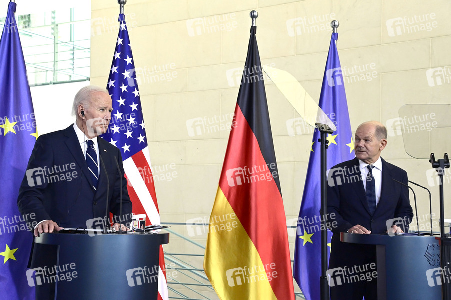 Joe Biden und Olaf Scholz beim Pressestatement nach dem bilateralen Gespräch des amerikanischen Präsidenten mit dem Bundeskanzler im Bundeskanzleramt. Berlin, 18.10.2024