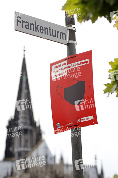 Die Maskenpflicht im Freien soll fallen. Diese und einige weitere Lockerungen der Corona-Schutzmaßnahmen kündigte das Land NRW an. Im Bild ein Hnweisschicht auf die Pflicht zum Tragen einer Mund-Nasen-Bedeckung, wie sie die Stadt Köln 2021 in der Innenstadt aufhing. Inzwischen sind die Schilder entfernt. (Archivbild, Themenbild, Symbolbild) Köln, 28.09.2021