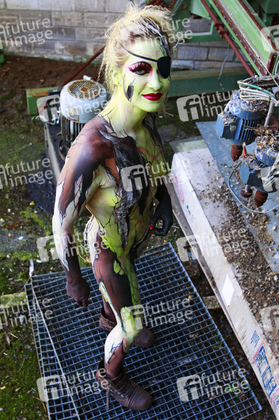 Bodypainting und Photoshooting mit Model Jutta auf einem Industriegelände in Hameln. Bodypaint-Künstler: Jörg Düsterwald, Make-Up und Hairstyling: Nadja Lück