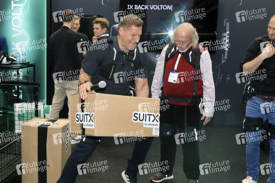 Ralf Moeller bei der Präsentation der Weltneuheit 'SUITX' am Stand des Medizintechnikunternehmens Ottobock auf der Hannover Messe 2025 auf dem Messegelände. Hannover, 31.03.2025