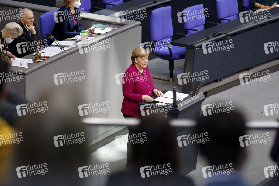 Angela Merkel in der 218. Sitzung des Deutschen Bundestages im Reichstagsgebäude. Berlin, 25.03.2021