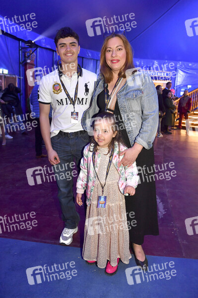 Julia Dahmen mit ihren Kindern Emilio und Angelina bei der Premiere des Circus Krone Tourneeprogramms 'Farbenspiel - Gold Edition' im Circus Krone Zelt auf der Theresienwiese. München, 10.04.2025