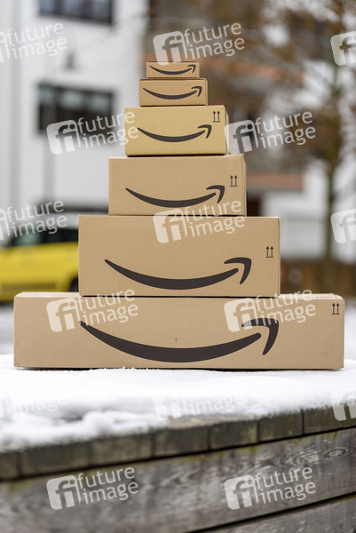 Abgestellte Amazon-Pakete - Einer der wenigen großen Gewinner der Coronakrise ist der Logistikriese Amazon. Die Gewerkschaft ver.di versucht seit April 2013, einen Tarifvertrag durchzusetzen, der die Löhne denen des Einzelhandels anpasst. (Sympoldbild, Themenbild) Nürnberg, 14.01.2021