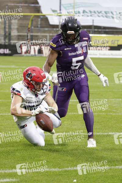 Maximilian Donalies (Hamburg Sea Devils WR) und Jamalcolm Liggins (Frankfurt Galaxy DB) beim American Football-Spiel Frankfurt Galaxy gegen Hamburg Sea Devils in der PSD Bank Arena. Frankfurt am Main, 30.06.2024