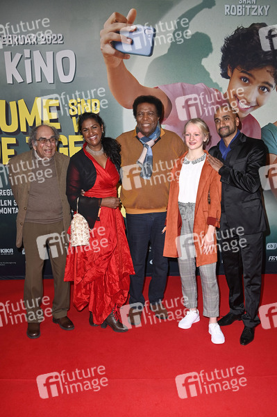 Irshad Panjatan, Sushila Sara Mai, Roberto Blanco, Annlis Krischke und Murali Perumal bei der Premiere des Kinofilms 'Träume sind wie wilde Tiger' im CinemaxX Halle. Halle (Saale), 02.02.2022