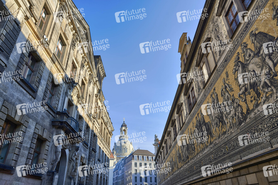 Der Fürstenzug in Dresden ist ein überlebensgroßes Bild eines Reiterzuges, aufgetragen auf rund 23.000 Fliesen aus Meißner Porzellan. Das 102 Meter lange, als größtes Porzellanwandbild der Welt geltende Kunstwerk stellt die Ahnengalerie der zwischen 1127 und 1873 in Sachsen herrschenden 34 Markgrafen, Herzöge, Kurfürsten und Könige aus dem Geschlecht des Fürstenhauses Wettin dar. Dresden, 30.11.2021