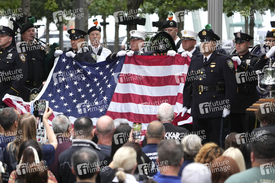 Polizisten Gedenkfeier für die Opfer der Terroranschläge vor 21 Jahren am 9/11 Memorial. Mit Schweigeminuten und der Verlesung der Namen der fast 3000 Todesopfer haben die USA am Sonntag an die Terroranschläge vom 11. September 2001 erinnert. Am früheren Standort des World Trade Centers in New York verlasen Angehörige wie jedes Jahr am 11. September die Namen aller Anschlagsopfer. New York, 11.09.2022