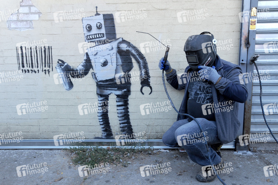 Street Artist, Art, Kultur, Künstler, Straßenkunst, Kunst, Grafitti, Roboter, Barcode