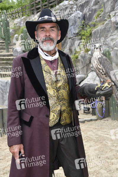 Prominenz, Fotoprobe, Fototermin, Pressetermin, Photocall, Fotocall, PK, Unterhaltung, Entertainment, Kultur, Western, Freilichtbühne, Kalkbergstadion, Open Air Theater, 69. Karl-May-Spiele 2022, Tier, Vogel, Falke, Schauspieler