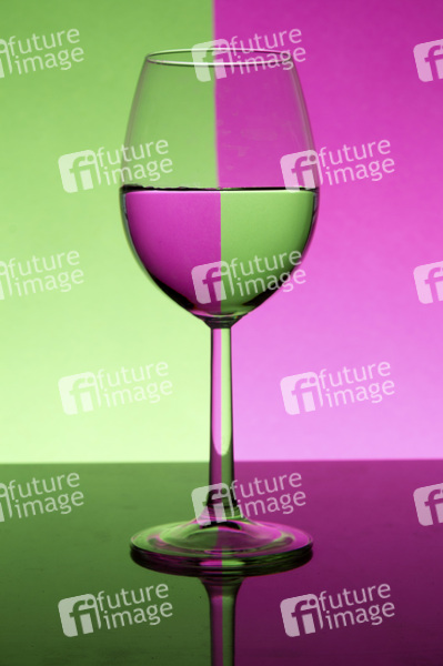 Spiegelung in einem Weinglas vor einem farbigen Hintergrund. (Symbolfoto, Themenfoto)