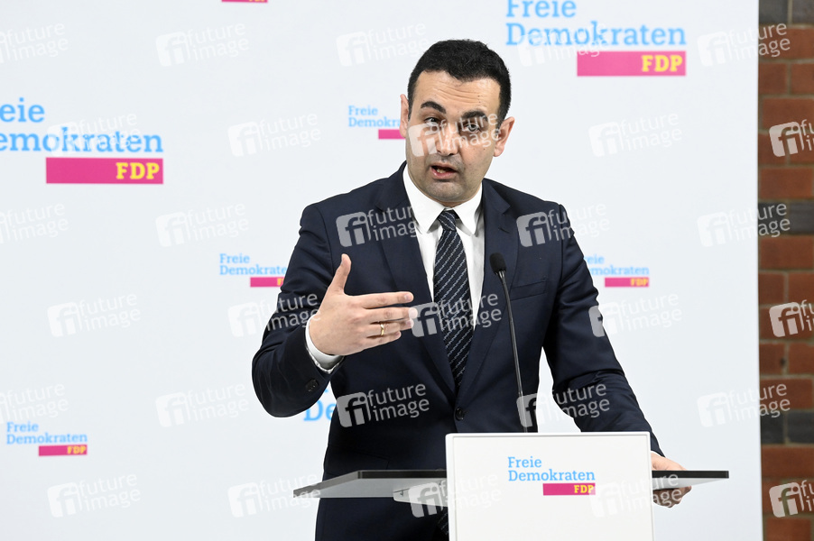 FDP-Generalsekretär Bijan Djir-Sarai beim Statement zu den digitalen Sitzungen des Präsidiums und des Bundesvorstands der Freien Demokraten im Hans-Dietrich-Genscher-Haus. Berlin, 24.01.2022