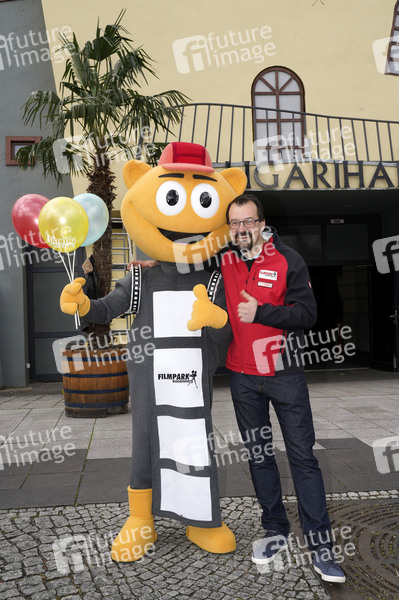 Malte Schatz und Flimmy vor der Caligari Halle. Am 9. April öffnet der Filmpark seine Tore für die diesjährige Saison. Neben der Ausstellung 'Filmische Gesichter der Stadt Potsdam' und der Outdoor-Filmset-Tour, die im letzten Jahr entstanden sind, gibt es in der Caligari Halle die neue Schau 'Die Geschichte der Traumfabrik'. Die indoor geführte Filmset-Tour würdigt den legendären Standort. Potsdam, 07.04.2022