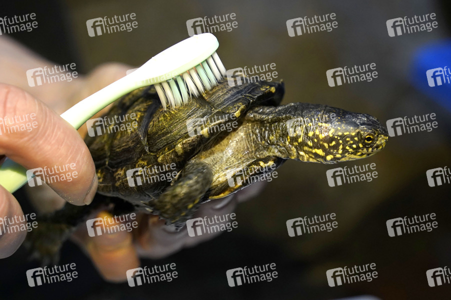 Sea Life, Schildkröten, Schildkröte. Putzen, Zahnbürste, Europäische Sumpfschildkröte, Extrapflege, Großreinigung, Wathose, Fensterwischer, Zollstock