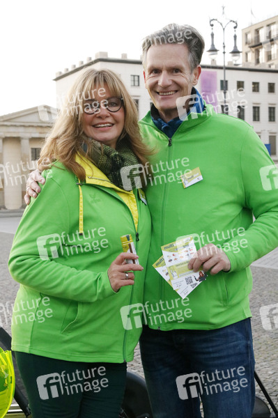 Maren Gilzer mit Ehemann Harry Kuhlmann bei der Präsentation ihres gesundheitsfördernden Superfoodsaftes von multishot am Brandenburger Tor. Berlin, 20.11.2020
