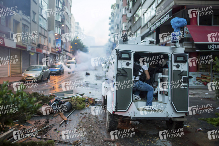 Die Polizei setzt auf Abstand und Tränengas aus den USA. Proteste nahe dem Taksim Platz und im Gezi-Park in Istanbul. Türkei, 16.06.2013