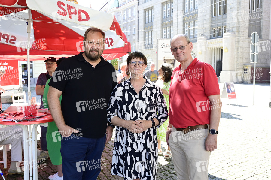Ralf Hofmann, Saskia Esken und Harald Baumann-Hasske bei einer Wahlkampfveranstaltung der SPD zur Landtagswahl in Sachsen auf dem Postplatz. Görlitz, 10.08.2024