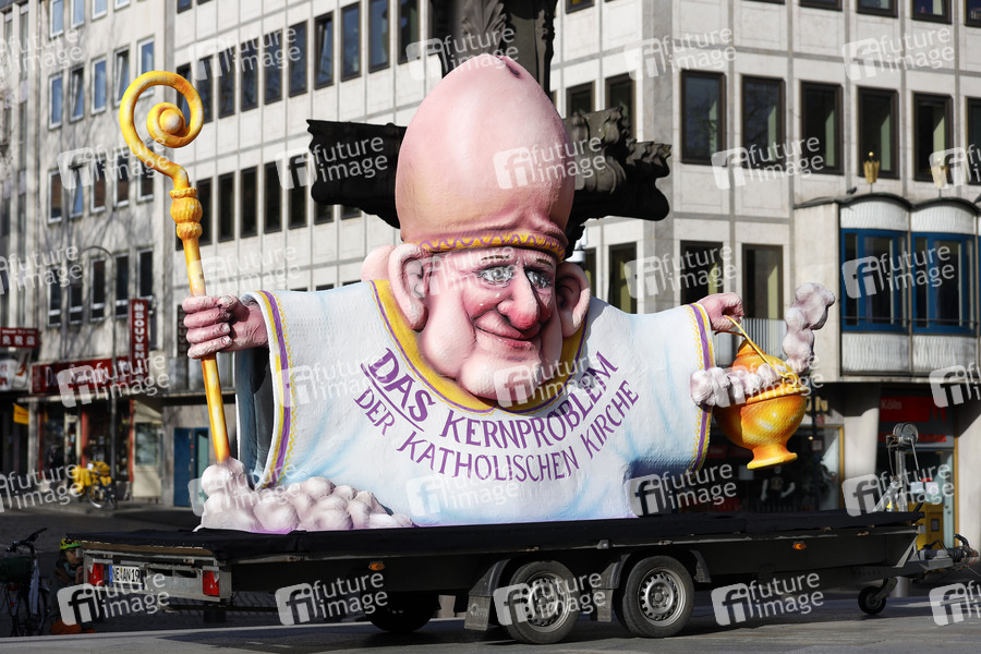 Künstler, Karneval, Karnevalswagenbauer, Skulptur, Plastik, Erzbistum Köln, Kölner Dom, Domstadt, Kirchenskandal, Kindesmissbrauch, Missbrauch, Aufarbeitung, Verzögerung, Verschleppung, Gutachten, Vertrauenskrise, Erzbischof, Kardinal, Gutachter, Missbrauchsfälle, Opfer, Entschädigung, unter Verschluss, Verdachtsfälle, Kirche, Kirchenaustritte, Kirchenaustritt, Kirchensteuer, Glaube, Konfession, Religion, Katholiken, Austrittswelle, katholische Kirche, Erzbischof Reiner Maria Woelki, Kardinal, Karikatur, Kirchenkritik, Kirchenkritiker, Priester, Pfaffen, Klerus, Sexualmoral, Motivwagen, Scheinheiligkeit, Bischofskonferenz, Bistum, Missbrauchsskandal, Symbolbild, Symbolfoto, Themenbild