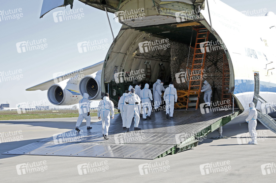 Ankunft einer Antonow 225 mit einer Lieferung von Schutzmaterial aus China auf dem Flughafen Leipzig/Halle. Mehr als zehn Millionen Schutzmasken kommen als Bundeswehr-Transport mit einer Antonow 225, dem größten und schwersten Frachtflieger der Welt, aus dem chinesischen Tianjin. Das Bundesministerium der Gesundheit hatte sich Anfang April mit der Bitte um Unterstützung beim Transport von Schutzausstattungen an das Bundesministerium der Verteidigung gewandt. Leipzig, 27.04.2020