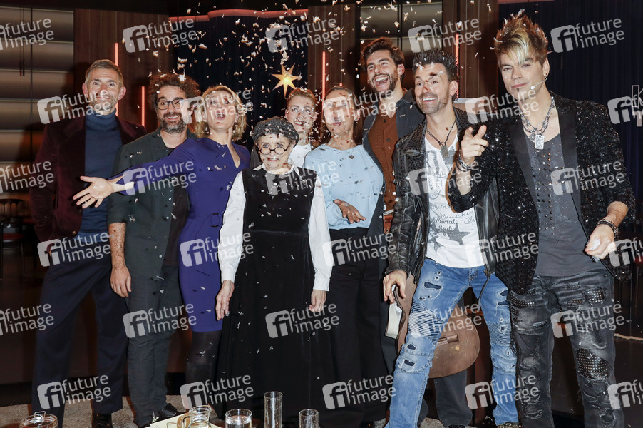 Micky Beisenherz, Oliver Wnuk, Susan Link, Katharina Thalbach, Sophia Nagelschmidt, Jenny Jürgens, Alvaro Soler, Andreas Ehrlich und Chris Ehrlich bei der Aufzeichnung der WDR-Talkshow 'Kölner Treff' im WDR Studio BS 3. Köln, 05.12.2024