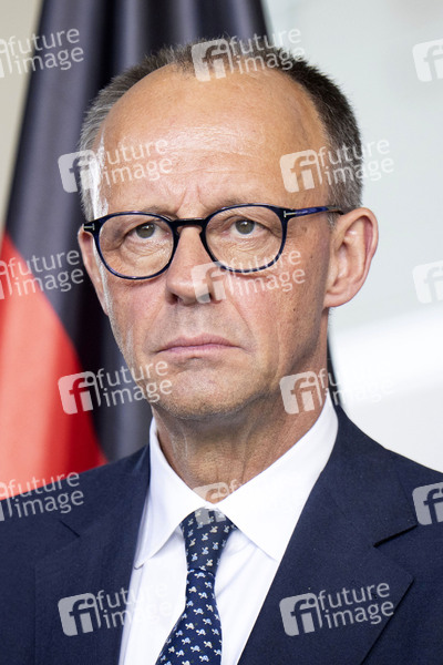 Friedrich Merz beim Empfang des Generalsekretärs der Vereinten Nationen zu einem gemeinsamen Gespräch mit anschließendem Pressestatement im Bundeskanzleramt. Berlin, 14.05.2025