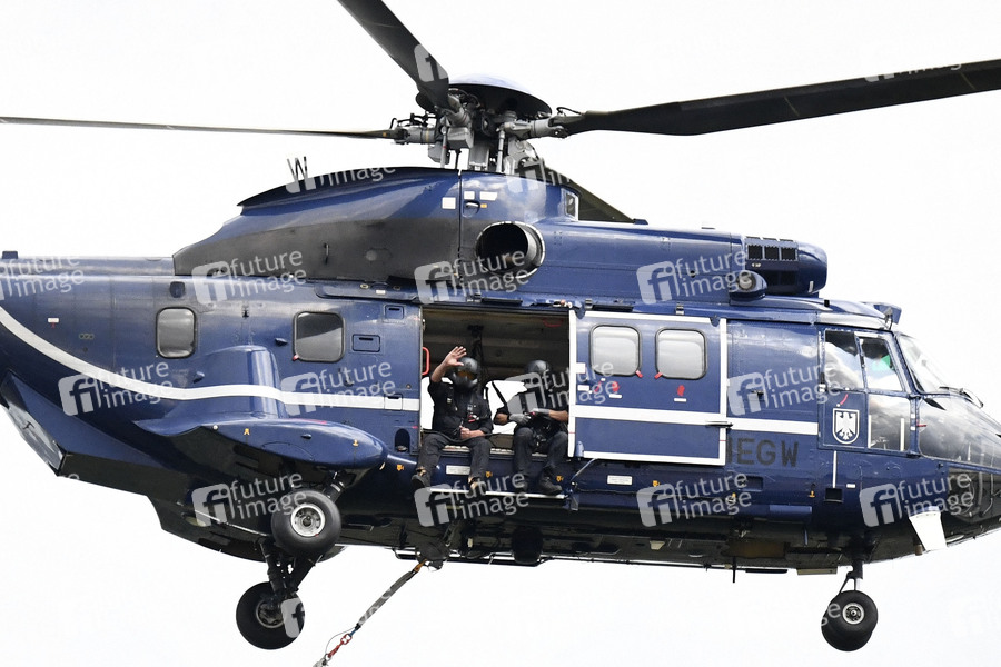 Löschhubschrauber beim Pressetermin in der Gohrischheide, wo es seit dem 1. Juli brennt. Derzeit wird von einer vom Brand betroffenen Fläche von etwa 2.100 Hektar ausgegangen. Aktuell befinden sich etwa 600 Kräfte von der Freiwilligen Feuerwehr, dem Technischen Hilfswerk, der Bundeswehr, der Polizei und anderen Organisationen in den fünf Einsatzabschnitten im Einsatz. Im Einsatzabschnitt Jacobsthal ist die Lage stabil. Es gilt weiterhin eine Ausbreitung des Brandgeschehens Richtung Süden zu verhindern sowie den alten Sprengplatz und die Ortschaft zu schützen. Jacobsthal, 07.07.2025