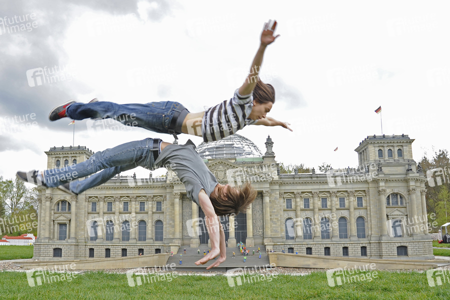 Fototermin zu 'Made in Berlin', der neuen Show im Wintergarten. Die jungen Artisten Eike von Stuckenbrok, David Pereira, Mareike Koch und das Duo Dennis und Lea zeigen einige ihrer Kunststücke im Modellpark Berlin in der Wuhlheide