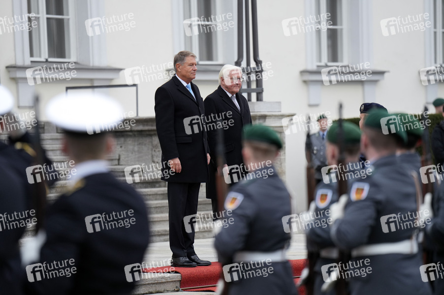 Klaus Iohannis und Frank-Walter Steinmeier beim Empfang des Präsidenten von Rumänien mit militärischen Ehren und zum gemeinsamen Gespräch im Schloss Bellevue. Berlin, 16.11.2024