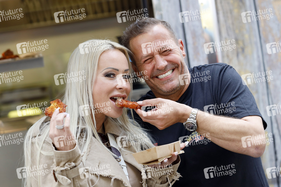 Cora Schumacher und Willi Herren bei der Eröffnung von 'Willi Herren's Rievkooche Bud'. Willi Herren stellt seinen Reibekuchen-Truck am Gelände der Selgros vor. Köln, 16.04.2021