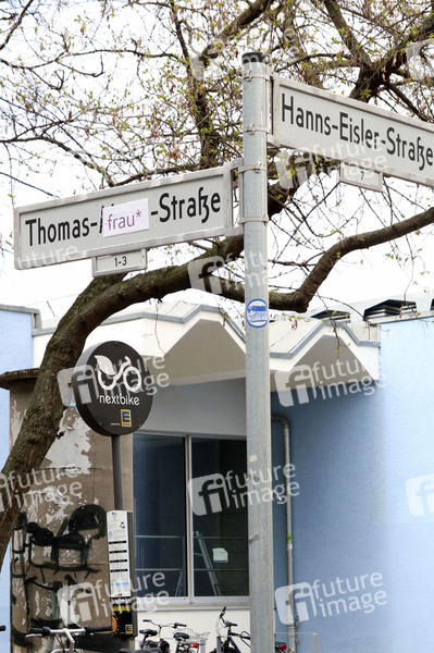 Unbekannte haben das Straßenschild Thomas-Mann-Straße überklebt mit 'Frau' im Prenzlauer Berg. (Themenbild, Symbolbild) Berlin, 22.04.2021