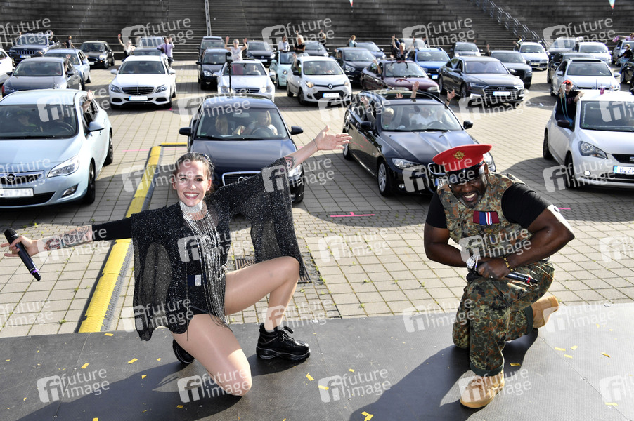 Sängerin, Sänger, Eurodance, Musik, Konzert, Auftritt, Bühne, Stage, live, Unterhaltung, Entertainment, Kultur, Corona, Sars-CoV-2, Covid-19, Coronavirus, Coronakrise, Corona-Krise, Corona-Pandemie, Coronamaßnahmen, Corona-Schutz, Kontaktverbot, Mindestabstand, Social Distancing, Abstand, Abstandhalten, Abstandsregel, Auto, Autokonzertreihe, Autokonzert, Auto-Konzert