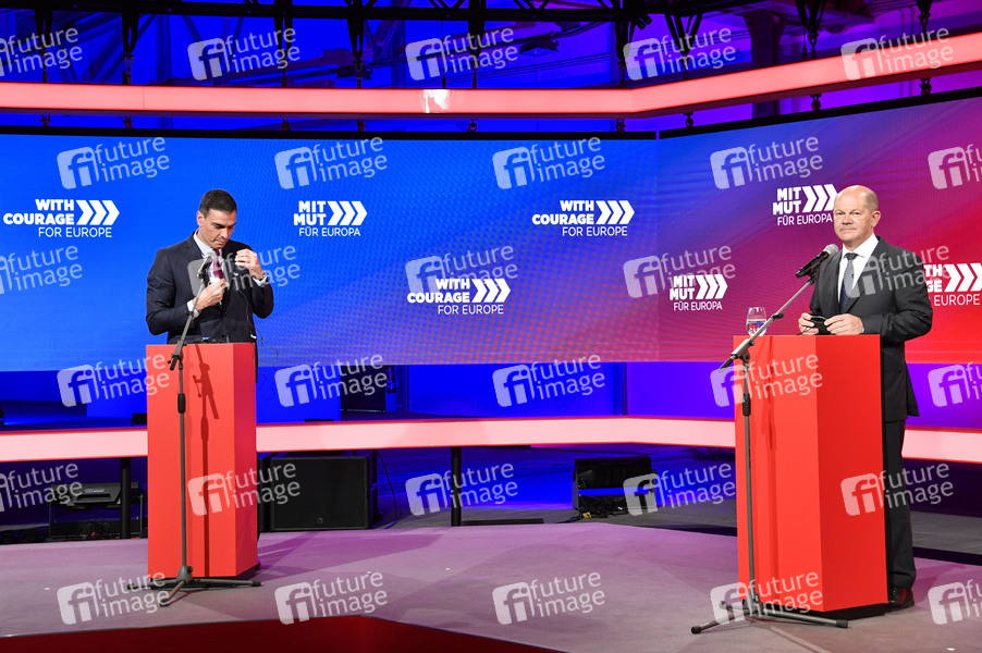 Pedro Sanchez und Olaf Scholz beim Pressestatement zum Auftakt des Europa-Wochenendes der SPE-Konferenz unter dem Motto 'Mit Mut. Für Europa' in der Station Berlin. Berlin, 25.06.2021