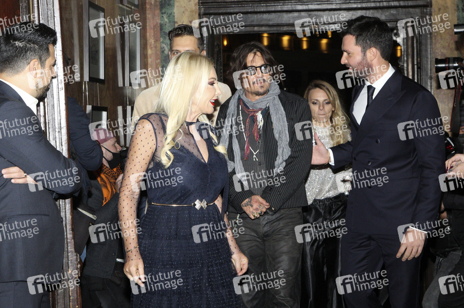 Monika Bacardi, Johnny Depp und Andrea Iervolino beim Galaevent zu Ehren Johnny Depps und zur Vorstellung der Zeichentrickserie 'Puffins' im Studio 1905. Belgrad, 19.10.2021