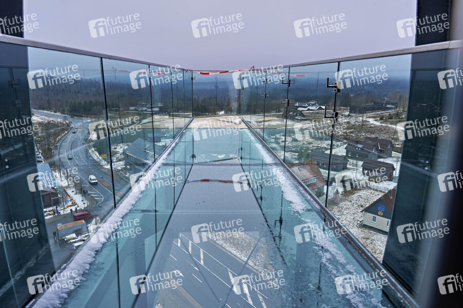 Der Harzturm ist ein 65 Meter hoher Aussichtsturm im Harz. Über eine Treppe oder einen Aufzug sind auf 45 Metern Turmhöhe zwei Panoramaplattformen, ein Skywalk mit gläsernem Boden und der Startpunkt einer 110 Meter langen Rutsche zu erreichen. Die hölzerne Turmschraube imitiert einen hohlen, drehwüchsigen Baumstamm. Dafür haben sich die österreichischen Planer, Architekt Dietmar Kaden und Tragwerksplaner Markus Lackner, das intelligente Naturdesign des aufgehenden Fichtenzapfens zum Vorbild genommen. Torfhaus, 25.02.2024