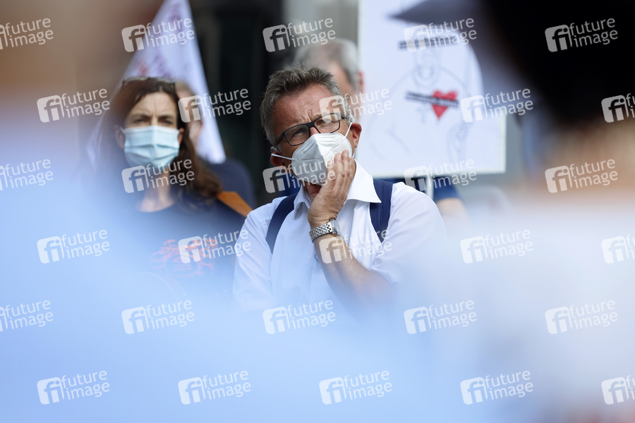Klaus Koltermann bei einer Kundgebung auf dem Börsenplatz, bei der Gläubige aus dem Erzbistum Köln und Aktivisten der Bewegung Maria 2.0 das Verhalten der Kirche und Erzbischof Rainer Maria Kardinal Woelki bei der Aufarbeitung des Missbrauchskandal kritisieren. Am Nachmittag trifft auch eine Pilgergruppe von Pfarrer Klaus Koltermann aus Dormagen Nievenheim mit 60 Christen nach 40 Km Fußmarsch unter dme Motto 'Aufbruch nach Köln' auf dem Börsenplatz ein. Koltermann hat sich als einziger Pfarrer in Deutschland für den Rücktritt von Kardinal Woelki ausgesprochen. Köln, 12.06.2021